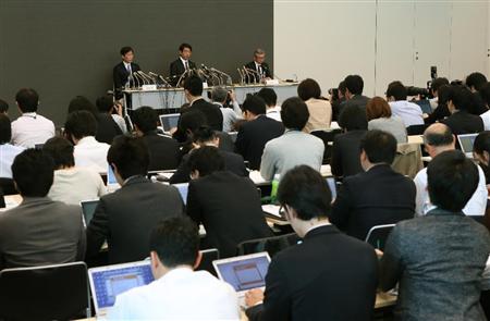 会見する笹井芳樹・理化学研究所発生・再生科学総合研究センター副センター長(中央)ら=16日午後、東京都千代田区(小野淳一撮影)