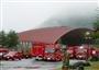 御嶽山の登山口へ続く道を警備する警察官ら。雨のため捜索活動は中止になった=3日午前、長野県王滝村