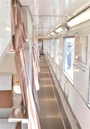 寝台特急「北斗星」の車内が報道陣に公開された。客車の通路=16日午後、東京都北区の尾久駅構内(宮崎瑞穂撮影)