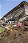 地震で倒壊した住宅の脇にたなびくこいのぼり=17日午前11時、熊本県益城町