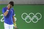 男子シングルス1回戦アルゼンチンのデルポトロ戦で、ポイントを失い悔しがるセルビアのノバク・ジョコビッチ。1回戦で敗退した=リオデジャネイロ(AP)