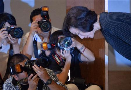 息子の高畑裕太容疑者が逮捕された問題をうけ、会見し頭を下げる高畑淳子さん=26日午前、東京都千代田区(三尾郁恵撮影)