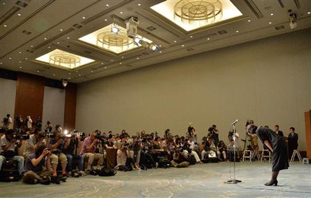 会見冒頭、頭を下げる高畑淳子さん=26日午前、東京都千代田区(三尾郁恵撮影)