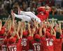 3回、広島・菊池涼介の打球を相手が失策する間に生還した田中広輔を迎える丸佳浩=東京ドーム(鳥越瑞絵撮影)
