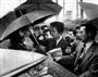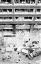 三菱重工ビル(右)で起きた爆弾テロでは乗用車はつぶれ、路上一面にガラスが散乱した=昭和49年8月30日、東京都千代田区丸の内