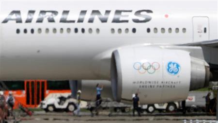 羽田空港に緊急着陸したJAL6便。トラブルの原因と思われる左エンジンを調べる関係者=5日、羽田空港(桐山弘太撮影)