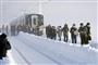 大雪の影響で立ち往生したJR信越線の電車=12日午前7時56分、新潟県三条市(共同通信社機から)