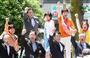 新潟県知事選で落選が決まり、菊田真紀子衆院議員(右)とともに支持者の前に現れた池田千賀子氏=10日夜、新潟市中央区(太田泰撮影)