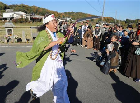 「帰れ、帰れ」とファンに“荒い歓迎”をする「濃茶の尼」=岡山県倉敷市