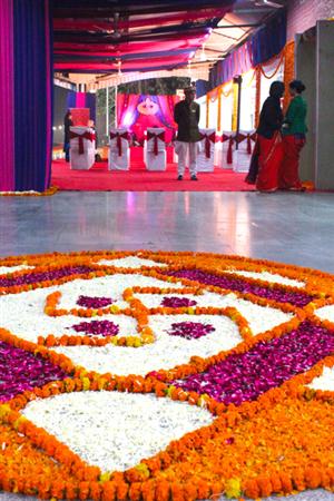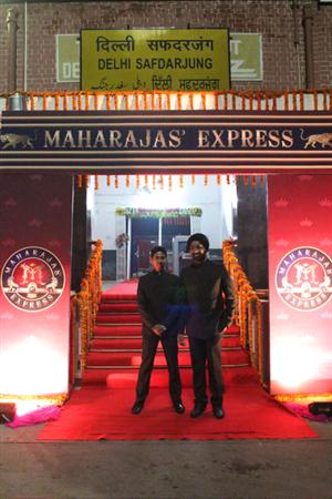 マハラジャ・エクスプレスが出発する日だけ造られるという急ごしらえのエントランスをくぐり、花と音楽で歓迎を受ける。10名の乗客に対して、ひと目で把握できないほどうじゃうじゃいる乗務員。これから7泊8日の旅が始まる。