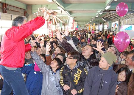 特設会場では、熱々のカニ汁やカニ雑炊、焼きガニの屋台などに長蛇の列ができた。「素人新鮮うまいもの競り市」は、金額を示す観光客の威勢のいい掛け声が飛び交い、1箱あたり9千円のカニが5千円、500グラムの但馬牛が500円など破格の安値で次々と競り落とされていた。