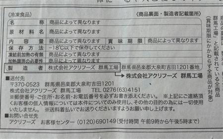 アクリフーズは昨年12月29日に開いた緊急会見で、表示のないPB商品があることは説明したが、翌日の朝刊に出した社告や自社ウェブサイトでは、回収対象商品を「商品の裏にアクリフーズ群馬工場と記載されている全商品」とした。これでは、工場名のないPB商品は回収対象かどうか分からない。中には「アクリフーズと書いてないから大丈夫」と思い、回収対象のPB商品を食べた人もいるかもしれない。
