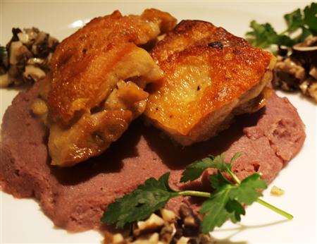 さて、私が今回楽しみにしていたのは「頬が落ちるほどおいしい」と名づけられた「甲州頬落鶏(ほおとしどり)」です。県の畜産試験場が開発した銘柄鶏で、地鶏のうまみに柔らかさを兼ね備え、低温の油でじっくり火を通したコンフィは、皮はパリパリ、肉はジューシー。ワインとの相性も抜群。なんといってもその香りの高さには驚きです。