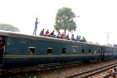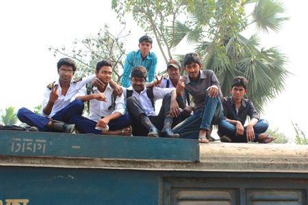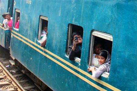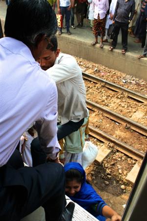 ダッカ・コムラプール駅(ダッカ中央駅)。線路に降りて車両を撮影していると、乗るつもりの列車が、車輪をきしませながらゆっくり動き始めるではないか。