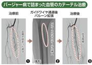 河原田医長は、糖尿病などが原因の動脈硬化の治療のために技術開発された、直径0・5ミリの極細で固く、滑りが良いガイドワイヤやカテーテルに着目。治療では、ガイドワイヤを太ももなどから動脈に沿って入れて通り道を作ってから風船付きカテーテルを入れ、取り付けた風船を膨らませて血管を1・5~4・0ミリ径に広げることで血流を再開させる。