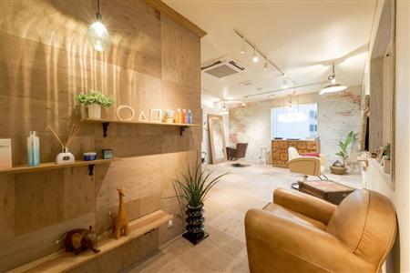 淡い木目調の壁と床で統一された室内。壁の棚にはしゃれた置き物が置かれ、まるでデザイナーズマンションのリビングのようだ。奥に何気なく置かれている鏡とイスがなければ、美容室にはみえない。