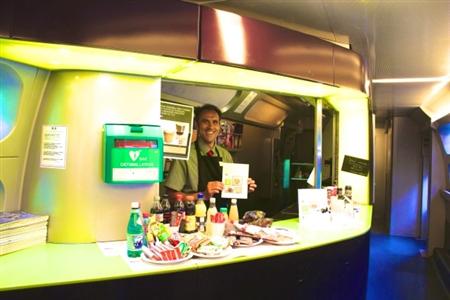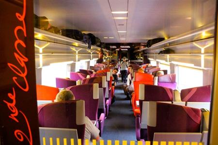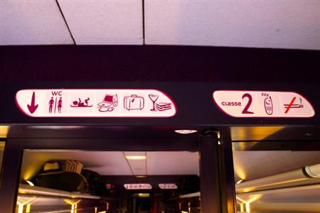 フランスを他のヨーロッパの国と比較するとき、よく“女性的”という比喩が使われる。車内を彩るデザインは、たとえば4月に取り上げたドイツ版新幹線ICEの実直な男らしさと比べてみてほしい。まさに女性的というフレーズがぴったりの艶やかな空間だ。