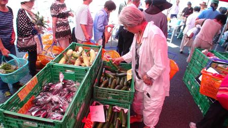 この日も700人ほどが列をなしてお目当てのものを手にし、午後2時過ぎには完売しました。1個10円のというお値打ち価格のピーマンやキュウリのほか、一見ピーマンですが、食べるとぴりりと辛い「ボタゴショウ」などもあります。