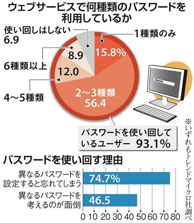 セキュリティー対策ソフト「ウイルスバスター」を開発しているトレンドマイクロ社が今年5月に実施したパスワードの利用実態調査によると、回答者の93・1%が「パスワードを使い回している」という結果が出た。