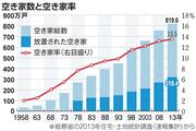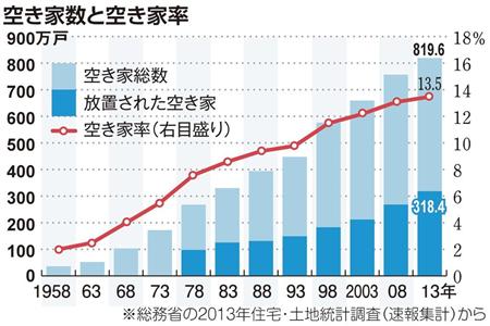空き家の増加に歯止めがかからない。総務省の2013年「住宅・土地統計調査」(速報集計)によれば、約820万戸と過去最高を記録した。総住宅数6063万戸の13・5%を占め、「7、8軒に1軒」といった割合だ。