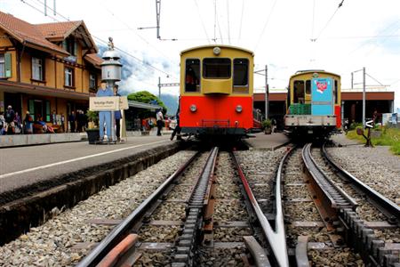 旅の目的地「シーニゲ・プラッテ」には、「シーニゲ・プラッテ高山植物園」があり、ここは神戸の「六甲高山植物」と“姉妹高山植物園”になっている。標高600mのヴィルダースヴィル駅と1967mのシーニゲ・プラッテ駅、最大勾配250パーミルの路線を、1893年に開通した2両編成の小さな登山鉄道「シーニゲ・プラッテ鉄道」が、最大時速12キロとゆっくりしたペースでのんびり登っていく。観光列車らしい大きな窓からは、コバルトブルーの湖やスイスらしいアルプスが一望でき、客席から大きな歓声が上がった。木造のレトロな車内には、うきうきと楽しげな雰囲気が満ち溢れている。窓を開けられるので、高地特有のきりっと冷たい空気が流れ込むのもいい。