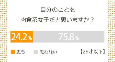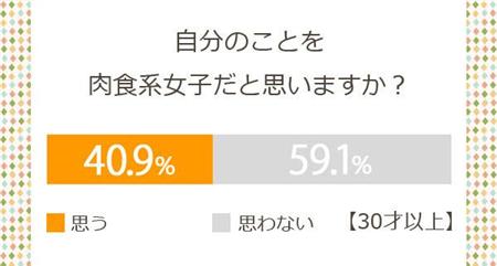年齢別にアンケートを実施したところ、「私は肉食系女子」と答えた割合は、29歳以下24.2%、30歳以上40.9%という結果に。なんと、30歳以上が29歳以下のほぼ倍。大人の女性はこれまでの男性経験をいかしてグイグイ引っ張る人が多いのかもしれない。