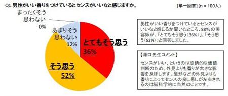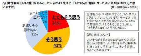 調査の結果、「男性がいい香りをつけているとセンスがいいと感じる」と美容師の88%が回答し、さらに62%が「男性客からいい香りがすると『いつもより接客・サービスに気を抜けない』と感じる」と回答した。また、美容師が考える、センスがいい印象を与える香りは、“柑橘系の香り”であることが分かった。