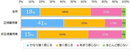 「仕事上のストレスをどの程度感じますか?」と質問したところ「かなり強く感じる」と回答した人は、全体では18%、雇用形態別では正規が41%、非正規が15%だった。「強く感じる」という数値も合わせると、全体では66%、正規は80%、非正規は64%の人が仕事でのストレスを感じていることがわかる。
