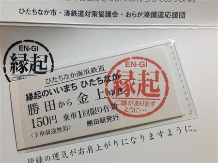 スタートは2003年。当時の市名・勝田=かつた=「勝った」から「勝つ町」で売り出そうといろんな「縁起もの」の開発してきました。まずは勝田駅から金上駅までの乗車券を「勝って金運が上がる縁起の良い切符」。その後、特産品のカツオを使った「カツオカツ」や神社で祈祷した「縁起のいいバッジ」「応援シール」等々です。