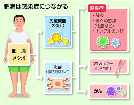 生活習慣病のリスクを高める肥満やメタボリックシンドローム(内臓脂肪症候群)が、感染症発症の危険因子でもあることがさまざまな研究で明らかになりつつある。肥満が免疫機能を変化させることが原因とみられる。肺炎などの重篤な症状を引き起こすこともあるといい、専門家は「肥満はさまざまな病気のリスク要因であることを改めて認識してほしい」と呼び掛けている。(大家俊夫)