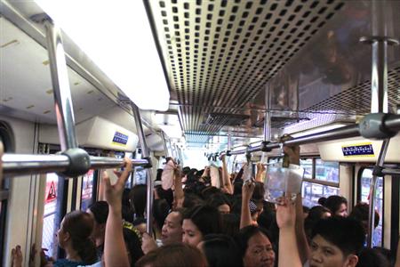 小さな子ども以外は、たとえ家族でも、男性が女性専用車に乗ることはできない。押し合いへし合いしながら列車の到着を待つ女性たちの行列に加わった夫婦は、駅員に見とがめられ、夫は妻を連れて男性用車両へと移動するはめになった。とはいえ、ここはフィリピン。