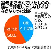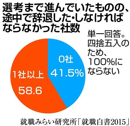 「就職白書2015」では、「選考まで進んでいたものの、途中で辞退した・しなければならなかった社数」を先輩に尋ねていますが、約6割が1社以上を「辞退した・しなければならなかった」と回答しています。