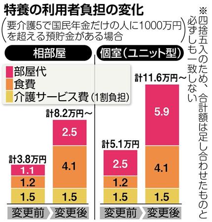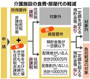 制度変更の対象は、3施設の長期・短期入所者の食費と部屋代の負担。通常は介護サービス費(自己負担は一般に1割)の他、食費と部屋代の実費がかかる。だが、所得の低い人は、実費の一部が介護保険財政から施設に補填(ほてん)され、負担が軽減される。