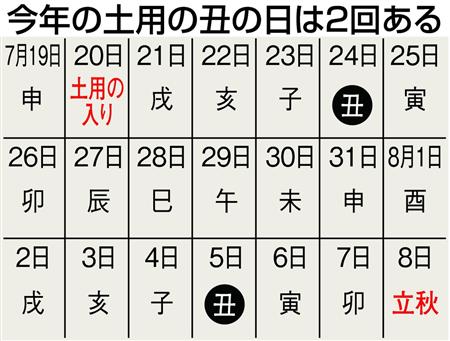 土用は節分や彼岸と同じ雑節の一つ。木火土金水に分けて世界の成り立ちを説明する陰陽五行説の考えなどにより、立春、立夏、立秋、立冬の直前の17~19日間が「土用」となる。国立天文台によると今年の立秋は8月8日で、夏の土用の入りは7月20日。今年は十二支の並びにより、丑の日は24日と8月5日の2回ある。
