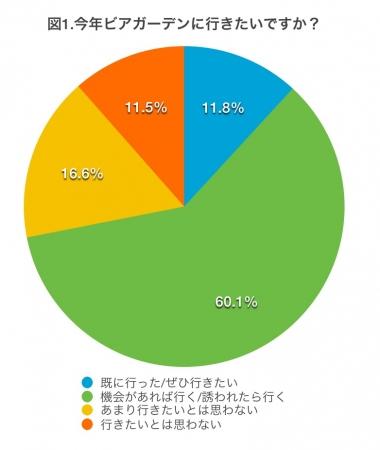 今年ビアガーデンに行きたいと考えている人は「既に行った/ぜひ行きたい」という自分から積極的に行く人が11.8%、「機会があれば行く/誘われたら行く」人60.1%と合わせ大半の女性がビアガーデンに前向きであることがわかった。