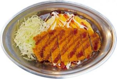 タマネギと卵を混ぜて薄く焼き、ケチャップとマヨネーズをかけて提供。トンカツは+200円。