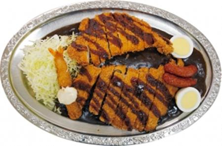 カツ2枚、ウインナー、エビフライなどがのり、ゴジラ級のボリューム。