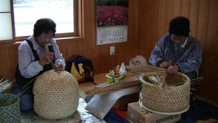 同会メンバーが道の駅・関川で観光客に猫ちぐらづくりを公開していると聞き、私も足を運びました。作り始めて10カ月目という女性2人。手際良く、かつ丁寧に稲わらを編み進めています。作り始めると6~7時間は手が止まらなくなるとか。それでも1個完成させるまで1週間はかかるそうです。