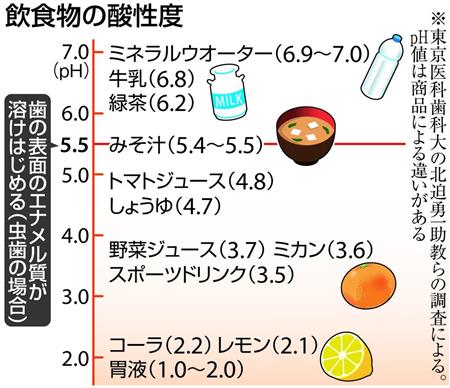 虫歯の原因は口内の虫歯菌が原因だが、最近はスポーツドリンクやレモンなど飲食物に含まれる酸で歯が溶けてしまう酸蝕歯(さんしょくし)になる人が増えているという。歯が黄ばんだり、欠けたりするだけでなく、知覚過敏も引き起こす。専門家は「酸性度の強い飲食物の摂取に注意して」と話している。(油原聡子)