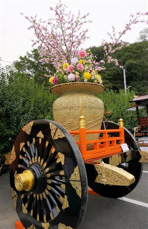 神輿は原爆での消失を免れた江戸期のもの。花車は江戸末期の広島のようすを記した「知新集」の絵から作成、3年かけて復元されました。半永久的に車輪が歪まないよう内部にワイヤーを施すなど、平成の匠の技術が集約されています。