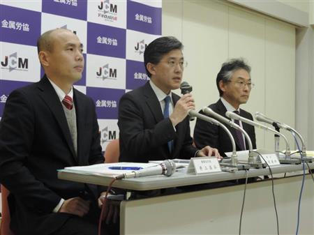 2016年闘争方針について記者会見する金属労協の相原康伸議長(中央)=4日、東京都墨田区【拡大】
