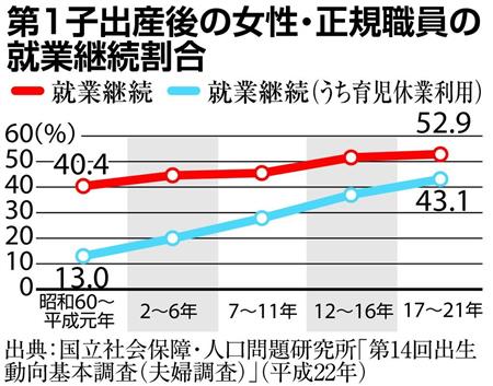 実は、正社員で働く女性の半数以上が、出産後も働き続けています。そして、育児休暇を取得する女性の割合は、20年の間に約3倍に増えています。今や、仕事と子育てを両立することは、決して特別なことではなくなっているのです。