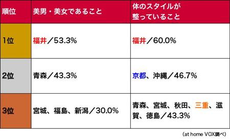 「美男・美女であること」「体のスタイルが整っていること」の2つでトップを飾ったのが福井だった。どちらの条件も半数以上の人が、ルックスの良さを求めていることがわかる。またスタイルの2位に京都、3位に三重がランクイン。この2エリアも後々出てくるので要チェックだ。では、3エリアを踏まえて、ステータスに関する結果を見てみると…