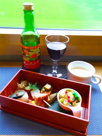 “元祖レストラン・トレイン”として、熊本の八代と鹿児島の川内を結ぶ「おれんじ食堂」。1号車の「ダイニング・カー」と2号車の「リビング・カー」の2両編成で、1号車はミールとお土産つきのパッケージプランのゲスト専用車、2号車は乗車のみで食事はつかない。私は、川内駅から新八代駅まで通しで乗車し、「ライトミール」と「サンセットディナー」の両方がつく「クルージングディナー」を選んだが、川内駅から出水駅までの前半、または出水駅から新八代駅までの後半のいずれかの区間だけでも乗車できる。