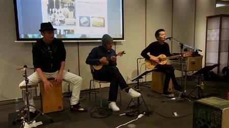 町の9割が山林という三重県大紀町のアマチュアバンド「ザ・ヒノキーズ」。その名から察せられるように演奏する楽器は地元産ヒノキ製です。ギター、ウクレレ、それにペルー発祥の打楽器カホンを使ってライブを行っています。