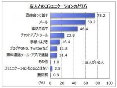 友人とのコミュニケーションのとり方を聞いたところ、「直接会って話す」(75.2%)、「メール」(59.2%)、「電話で話す」(46.4%)が上位3位。「チャットアプリ・ツール」「メール」は、女性が男性を16~17ポイント上回った。「チャットアプリ・ツール」「無料通話ツール・アプリで通話」は若年層、「ブログやSNS、Twitterなど」も女性若年層で比率が高くなっている。一方、「メール」は30代以上、「電話で話す」は50代以上で比率が高い傾向が見られた。