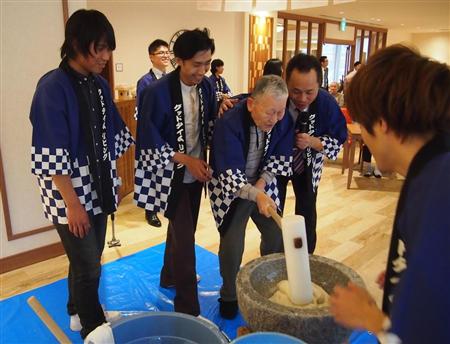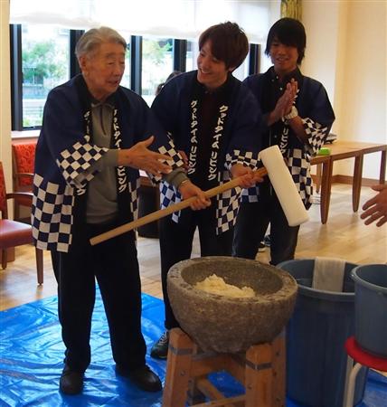 有料老人ホームに入居する中務武市さん(87)は「杵を握るのは久しぶりで楽しかった。学生と一緒に時間を過ごすと若返る」と喜び、大阪府立大1年の鈴木円香さん(21)は「老人ホームの部屋によく遊びにいっておしゃべりする。一緒にいるだけで楽しい」と話した。