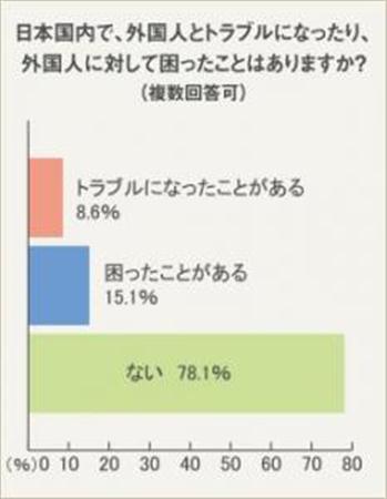 はじめに、「日本国内で、外国人とトラブルになったり、外国人に対して困ったことはありますか?」という質問をしたところ、「トラブルになったことがある」と答えた人が8.6%、「困ったことがある」と答えた人が15.1%、「ない」と答えた人が78.1%だった。
