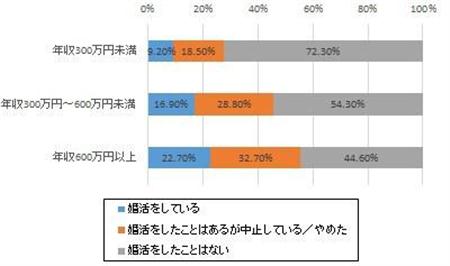 続いて、年収と婚活状況の関係性について、調べた結果、「300万円未満」(婚活率:9.2%、婚活経験率:18.5%)、「300万円以上600万円未満」(婚活率:16.9%、婚活経験率:28.8%)、「600万円以上」(婚活率:22.7%、婚活経験率:32.7%)という3つのグループで、婚活率の差が大きくなっていることがわかった。