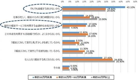 さらに、婚活未経験者に対して婚活をしてこなかった理由を複数回答方式で質問し、「300万円未満」「300万円以上600万円未満」「600万円以上」という年収グループ別に集計してみたところ、年収が「300万円未満」のグループで他グループよりも多く選ばれた項目は、「そもそも結婚する気がないから」(43.1%)と「有料の婚活サービスを利用する金銭的な余裕がないから」(17.0%)。一方、「600万円以上」のグループでは、「仕事が忙しく、婚活のために使う時間がないから」(23.9%)を選ぶ回答者が多くなった。